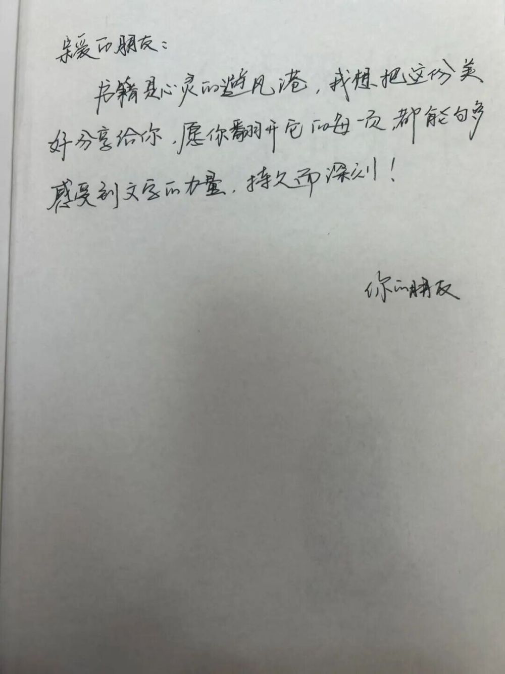 3.爱心留言:倡议捐赠者在图书中留下亲笔留言,可以是阅读心得,也可以是美好祝福等。