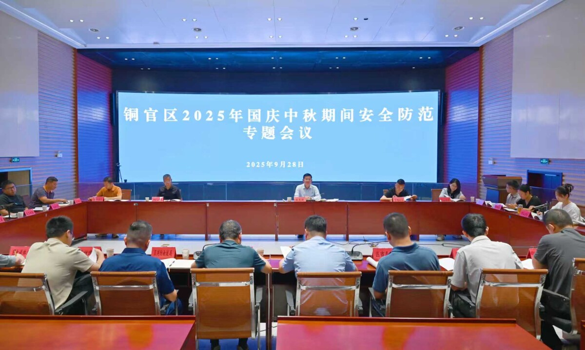 9月28日下午,铜官区2025年国庆中秋期间安全防范专题会议在智慧铜官召开,铜官区委常委、常务副区长徐进超主持会议并讲话。狮子山高新区、横港化工园区,各镇办社区及区安防减救委成员单位负责人参会。