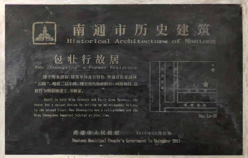 西南营34号,坐落于南通老街一隅,外观并不起眼,如果不是墙上那块“南通市历史建筑”铭牌的提示,过往行人很容易与之擦肩。然而,轻轻推开那扇尚待修整的木门,踏入的却是明末清初士人包壮行构筑的精神故园——一方融合了其哲思、美学与人格追求的“咫尺山林”。