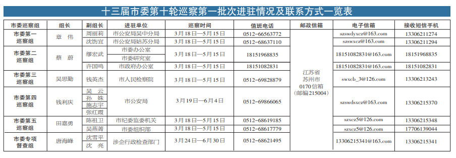 根据市委关于巡察工作的统一部署,十三届市委第十轮巡察采取“一次动员、两批实施”的方式压茬推进,日前已完成首批进驻工作。市委巡察组将对市纪委监委机关、市人民检察院党组、市委办公室、市政府机关党组、市委组织部、市委研究室、市公安局党委开展巡察,延伸巡察市公安局吴中分局、姑苏分局党委,同步对市委第七轮巡察中规范涉企行政检查专项巡察发现问题的整改情况开展专项督查。