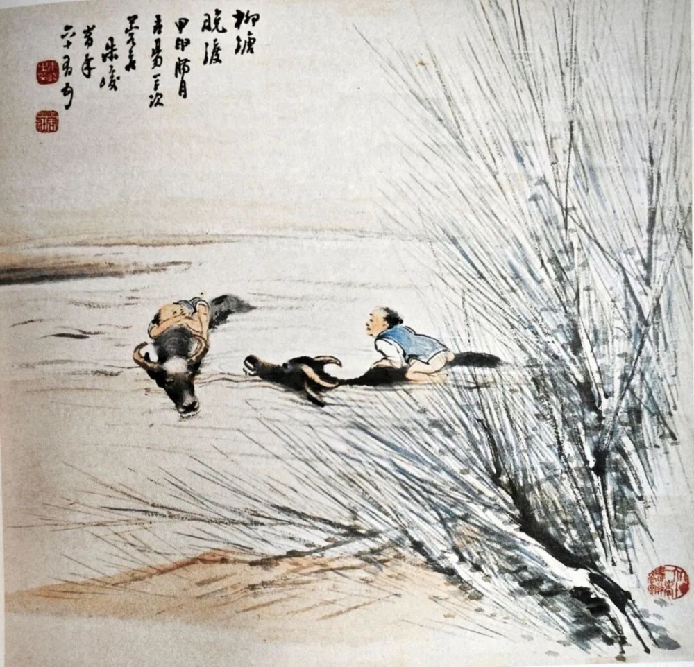 朱蓉庄的艺术视野十分开阔,他重视戏曲这类俗文化,创作了《长生殿酒楼》等戏曲人物画,并抄录曲词作为题款。他的作品也充满乡土气息和民间情调,如多幅《柳塘晚渡》中画光屁股的牧童,扇面画“双猪伴读”等,率真有趣,展现了以俗为雅、雅俗融合的艺术取向。