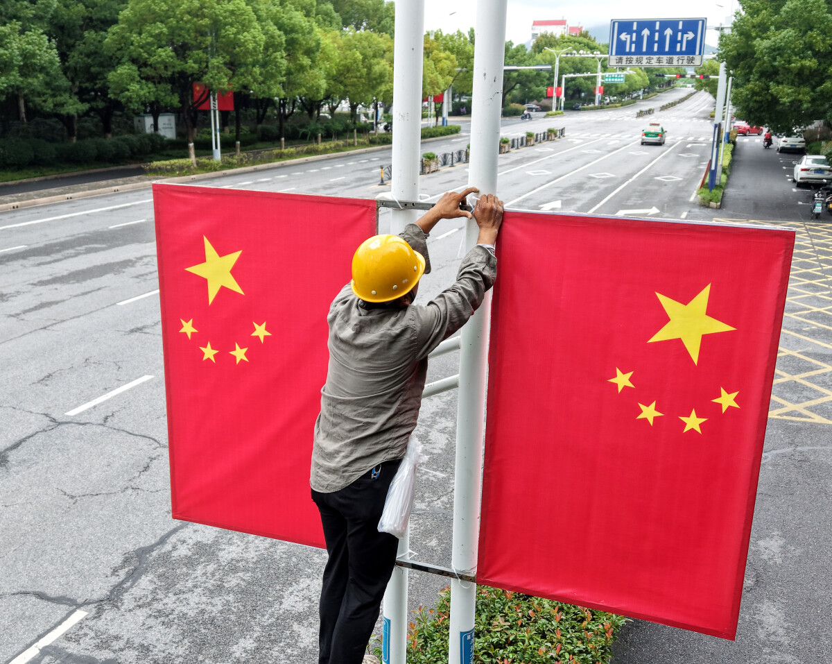 ↑ 9月26日上午,工人在巢湖市半汤路上悬挂国旗。