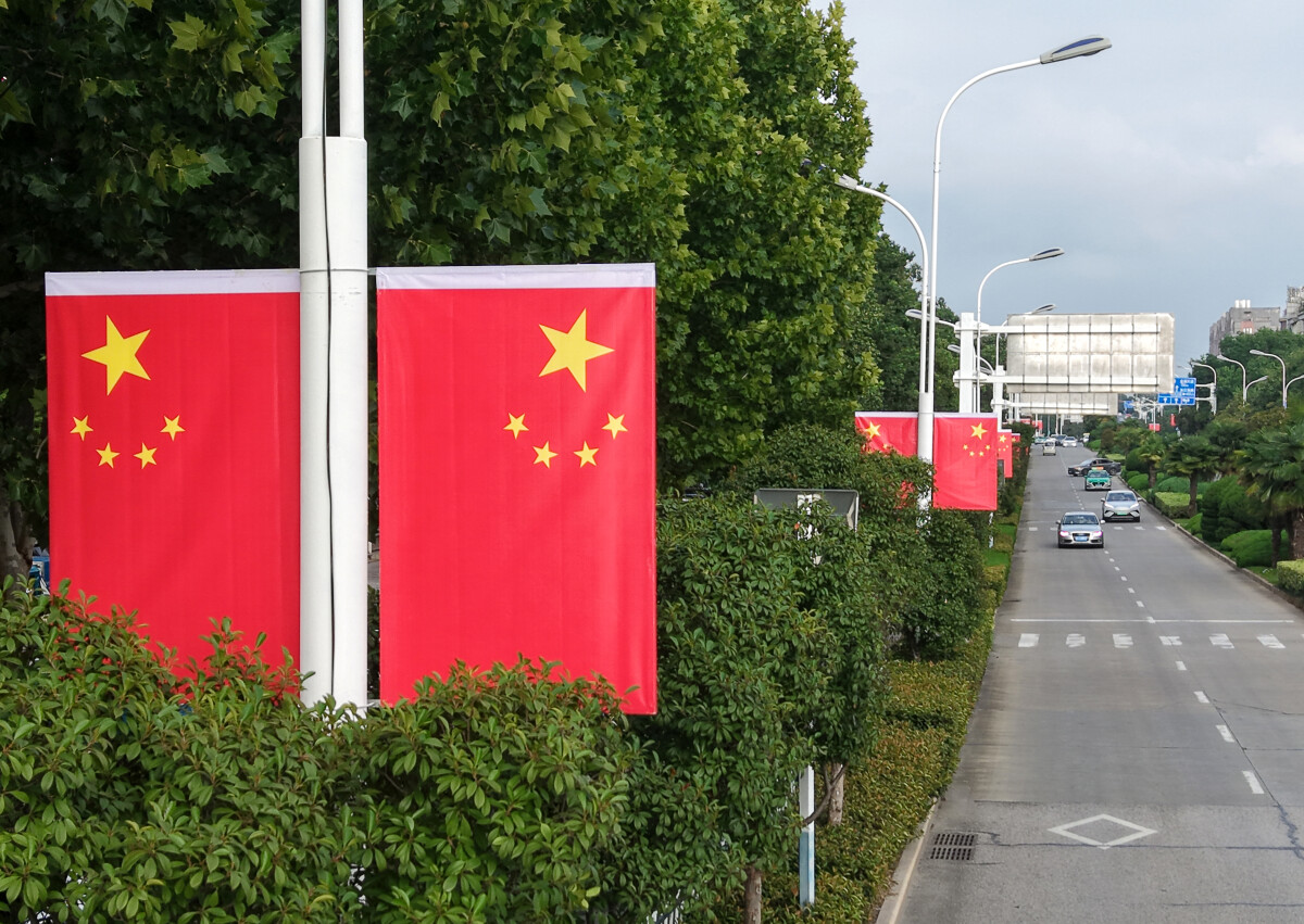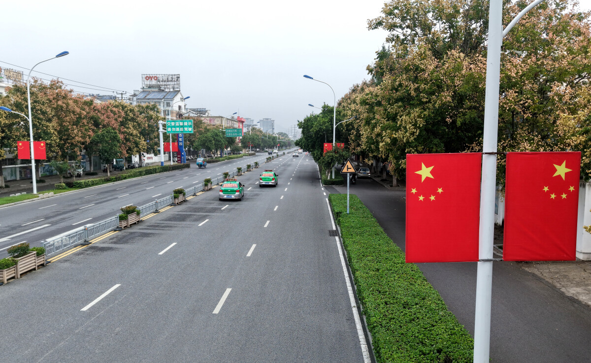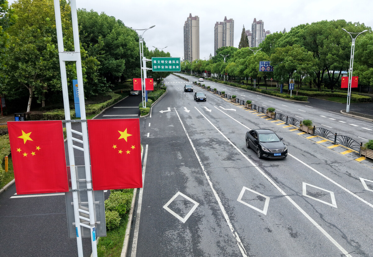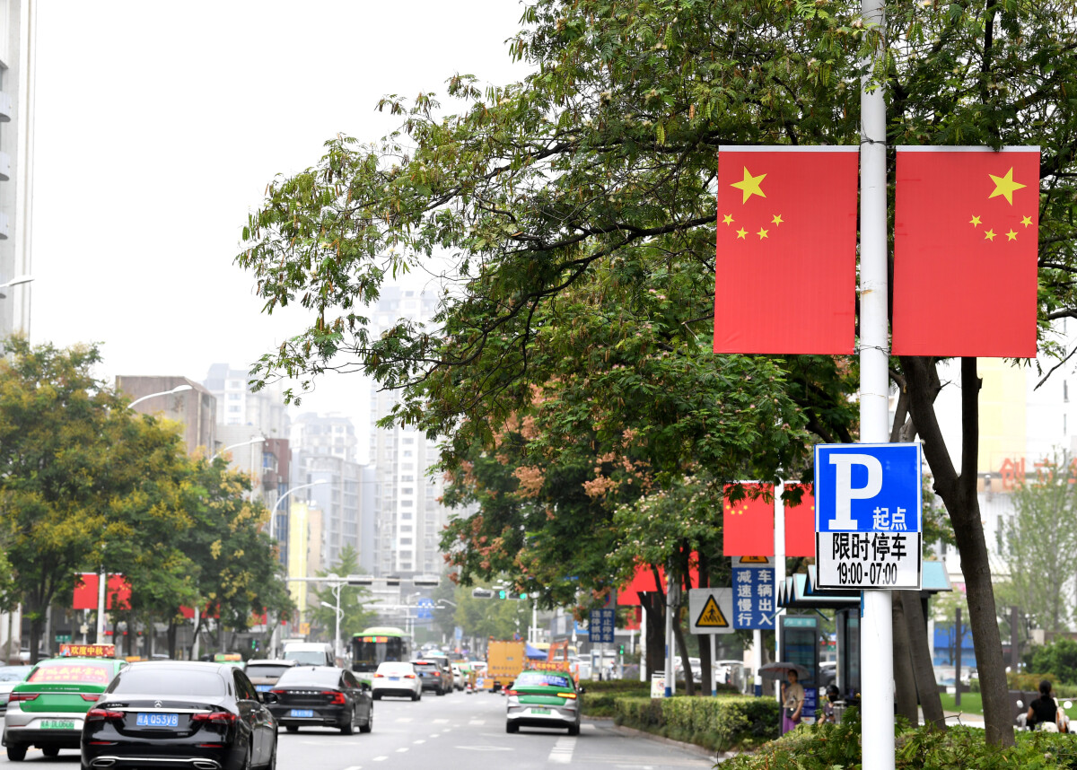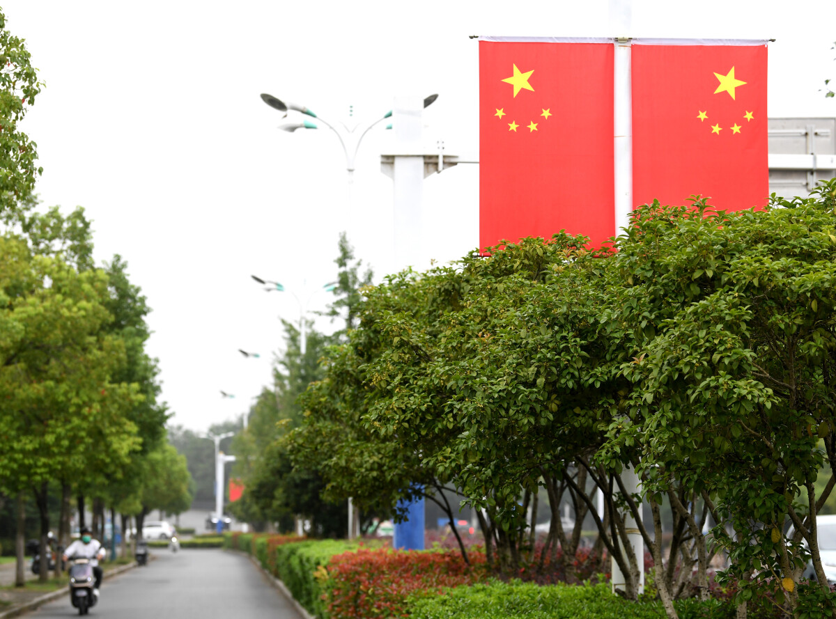 ↑ 9月27日,巢湖市健康东路上悬挂的国旗。