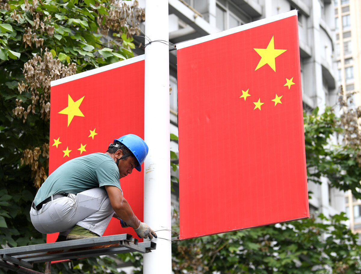 ↑ 9月27日上午,工人在巢湖市健康东路上悬挂国旗。