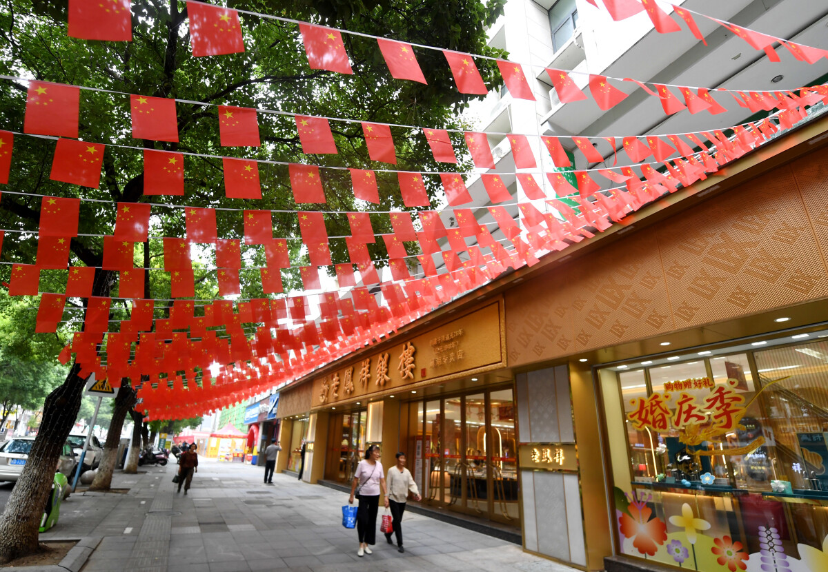 ↑ 9月27日,巢湖市人民路商业街商家悬挂的国旗。