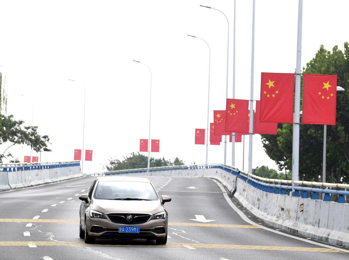 ↑ 9月28日,巢湖市太湖山路上悬挂的国旗。