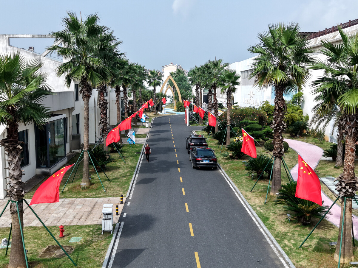 ↑ 9月28日,巢湖香蜜园庆典中心悬挂的国旗。