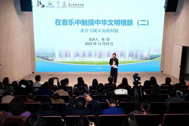 从2024年5月底的初次相见,到如今的蓬勃发展,徐汇文明夜课的每一步都离不开广大市民朋友们的支持。恰逢新年将至,徐汇区委宣传部(区精神文明办)携手上海音乐学院特别策划跨年音乐会,举办了一场沉浸式新年音乐思政主题课《在音乐中触摸中华文明根脉——来自雪域天山的问候》。课程由上海音乐学院党委宣传部副部长肖阳主讲,通过音乐这一跨越语言与地域的艺术形式,引领参与者走进新疆与丝路,感知中华文明多元一体的文化脉络。
