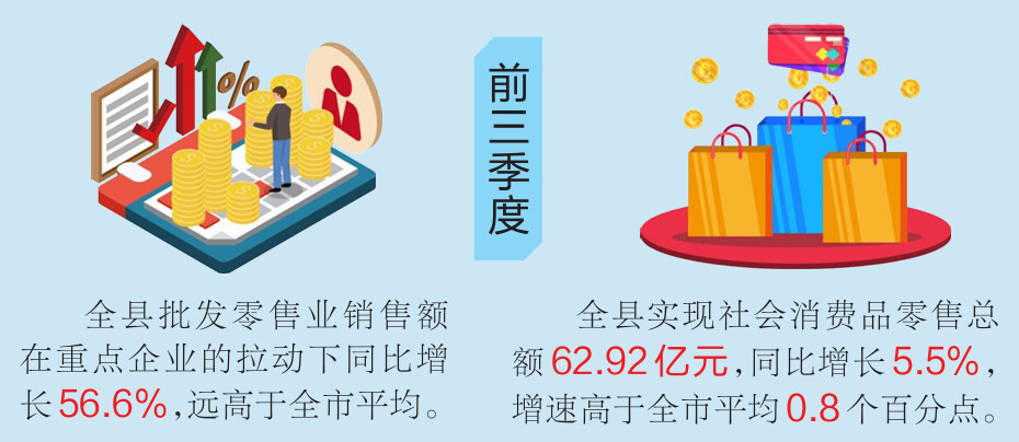 日前,记者从县统计部门获悉,今年前三季度,全县服务业增加值、批发零售业销售额、限上批零销售额、社会消费品零售总额等主要指标保持良好增势。