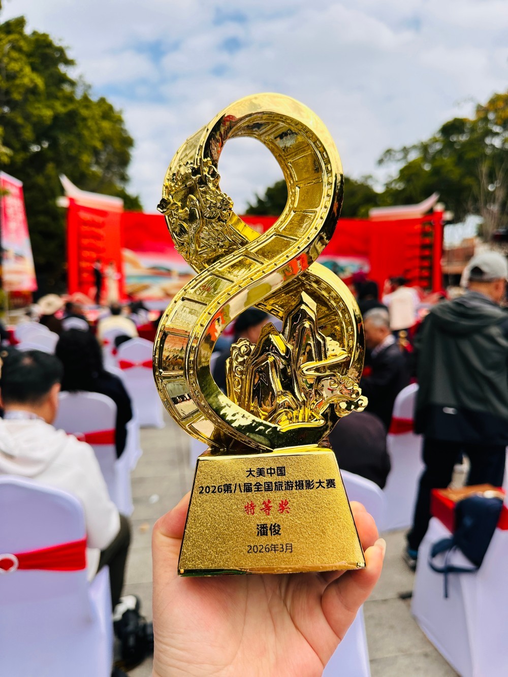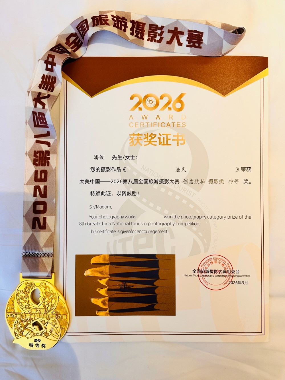 3月16日上午,“大美中国2026第八届全国旅游摄影大赛”颁奖典礼在福建泉州府文庙前广场隆重举行,近300位来自全国各地的摄影师及泉州当地领导出席。南京市建邺区摄影家协会副主席潘俊的摄影作品《渔民》,获得“创意航拍摄影类特等奖”。