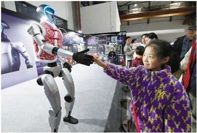 图为今年3月在杭州武林之星博览中心举办的2025环梦AI智能机器人科普展上,小观众与舞台上的宇树科技机器人握手。