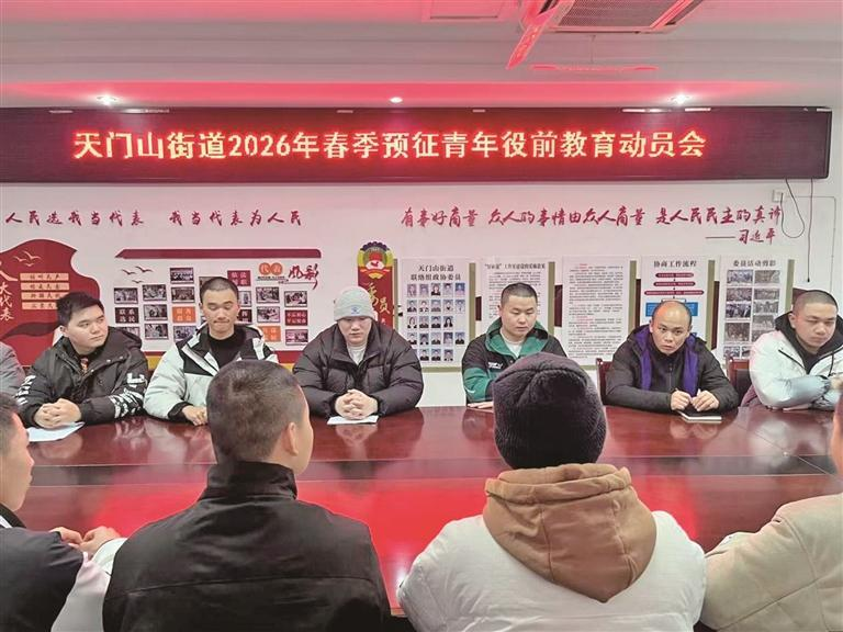 本报讯(记者 齐雯雯)为帮助预征青年提前适应军营生活、进一步筑牢从军报国思想根基,3月2日天门山街道召开2026年春季预征青年役前教育动员会,全体预征青年及街道相关工作人员参加会议(如图)。