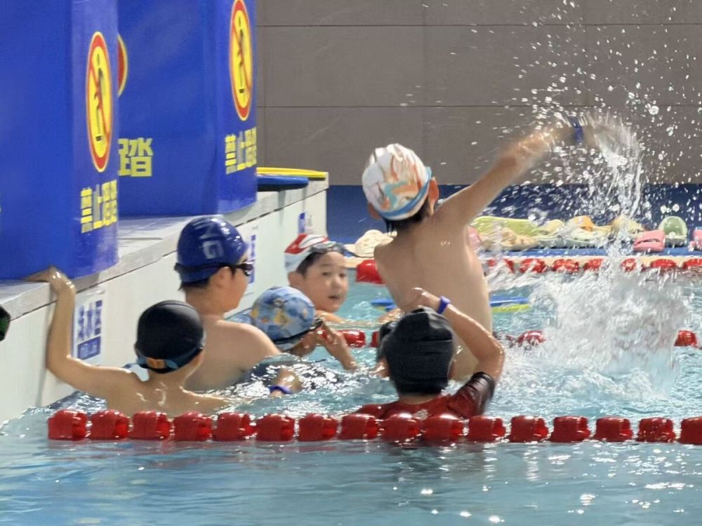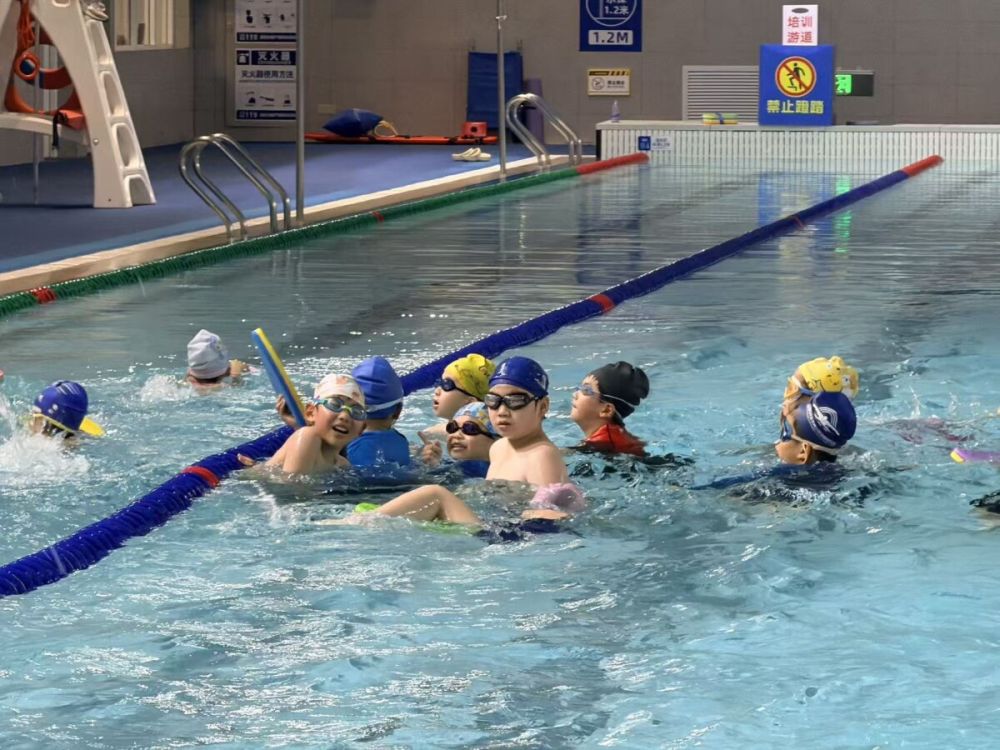 一走进游泳馆,馆内的暖气便让人忘记寒意。只见泳池内,几十个孩子在水中尽情舒展身姿——从只有泳圈高的小不点,到个子快赶上大人的少年,专注地投入训练。