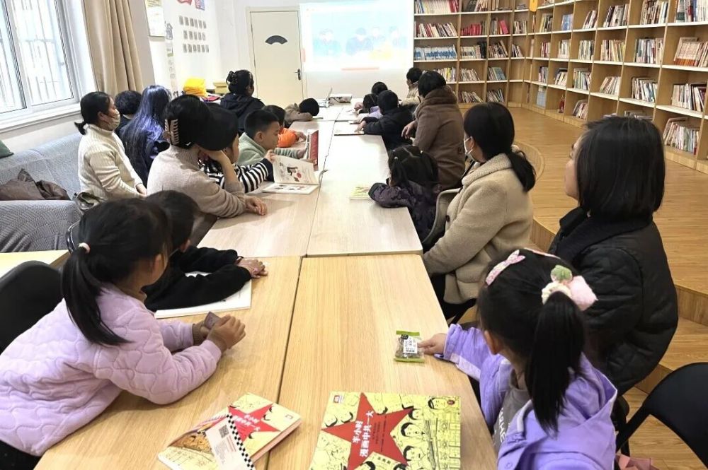 观影结束后,“亲子共读研学”环节接续展开。志愿者引导青少年与家长共同翻阅《半小时漫画党史》,书中以幽默笔触铺陈党史发展脉络,用通俗化表达解读关键历史节点的深层逻辑。家长结合动画片段与孩子对照讨论,志愿者适时点拨,让青少年在亲子共读的互动氛围中深化对党史的理解,红色记忆也由此变得鲜活可感、入脑入心。