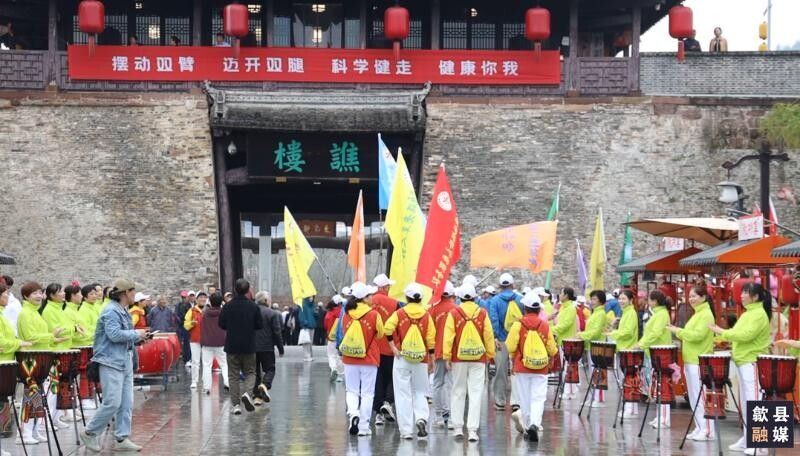 活动在热情洋溢的暖场表演中拉开序幕。手鼓、功夫扇、柔力球等精彩节目将现场氛围烘托得喜庆热烈。随着开赛鸣笛声的响起,健步走队伍自府衙广场出发,沿着古城墙、徽园、许国石坊等标志性景点前行。参与者身着各色运动服,手持健步杖,步伐铿锵有力。一面面红旗在队伍前列迎风舞动,与涌动的身影交织,汇成一道流动的风景线。