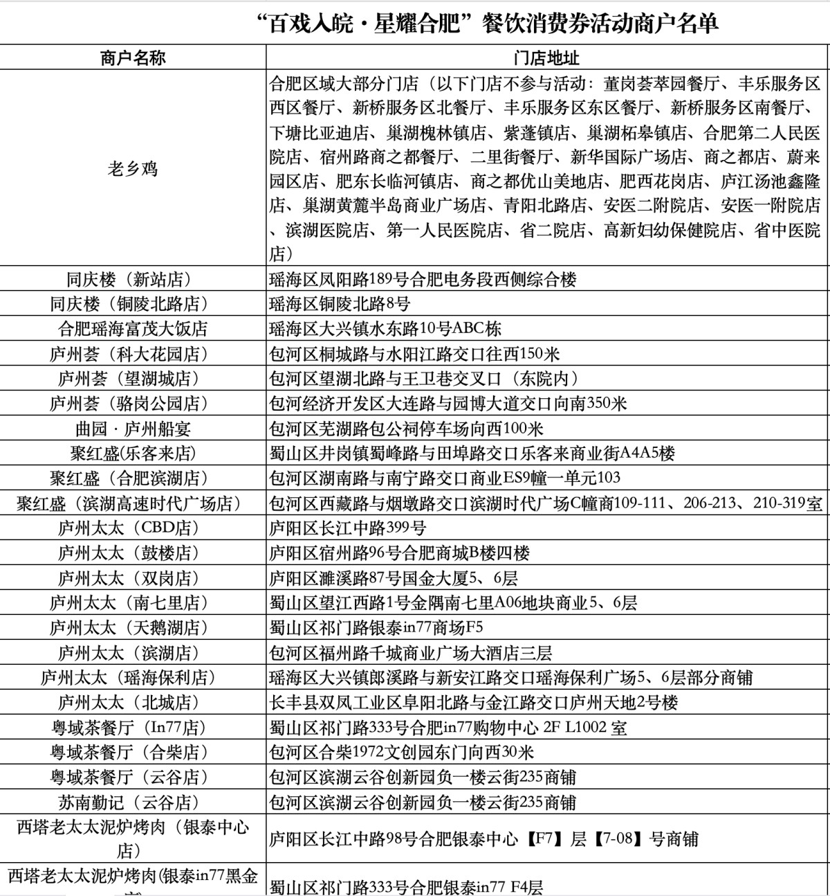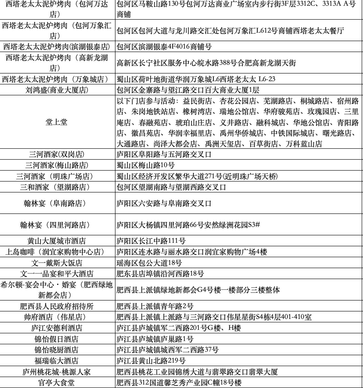 附:“百戏入皖·星耀合肥”餐饮消费券活动商户名单