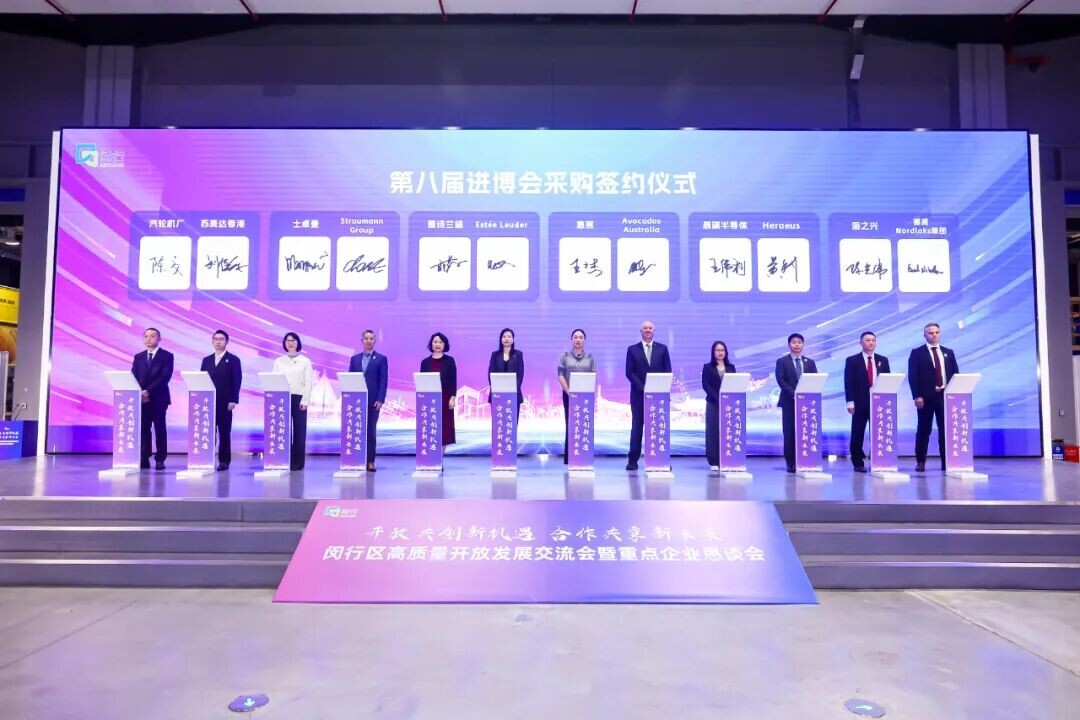 从进博会的“展品”到落地闵行的“商品”,闵行正以交流会为纽带,推动单一交易向长期合作转化,通过进博平台实现价值延伸。会上,雅诗兰黛、惠展国际、士卓曼等16家企业及平台现场完成意向采购签约。
