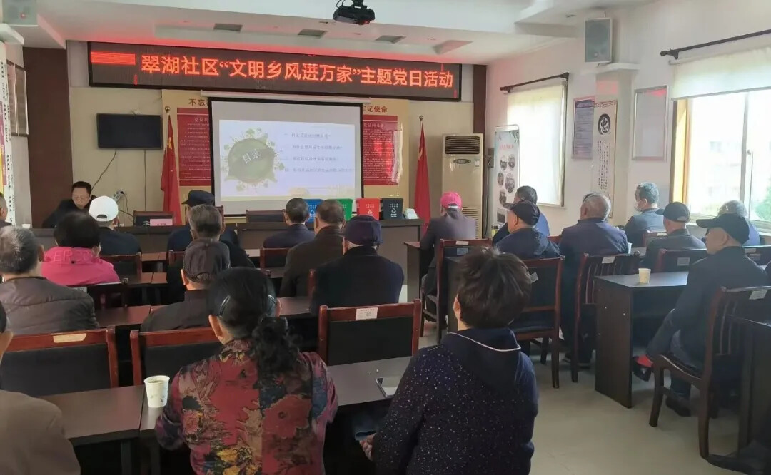 10月25日上午,新城办翠湖社区组织开展“文明乡风进万家”主题党日活动,通过室内专家讲解及室外集中宣传的方式,向居民群众普及垃圾分类、厉行节约、移风易俗等内容。(新城办 吴瀛洲)