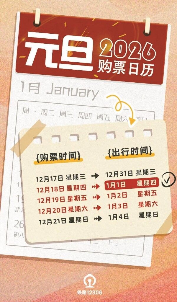 如果想在元旦假期前一天结束工作后出行,那么今天,你就可以买到12月31日的火车票了。而2026年1月1日当天,也就是假期第一天的火车票,则将在12月18日,也就是明天起售。