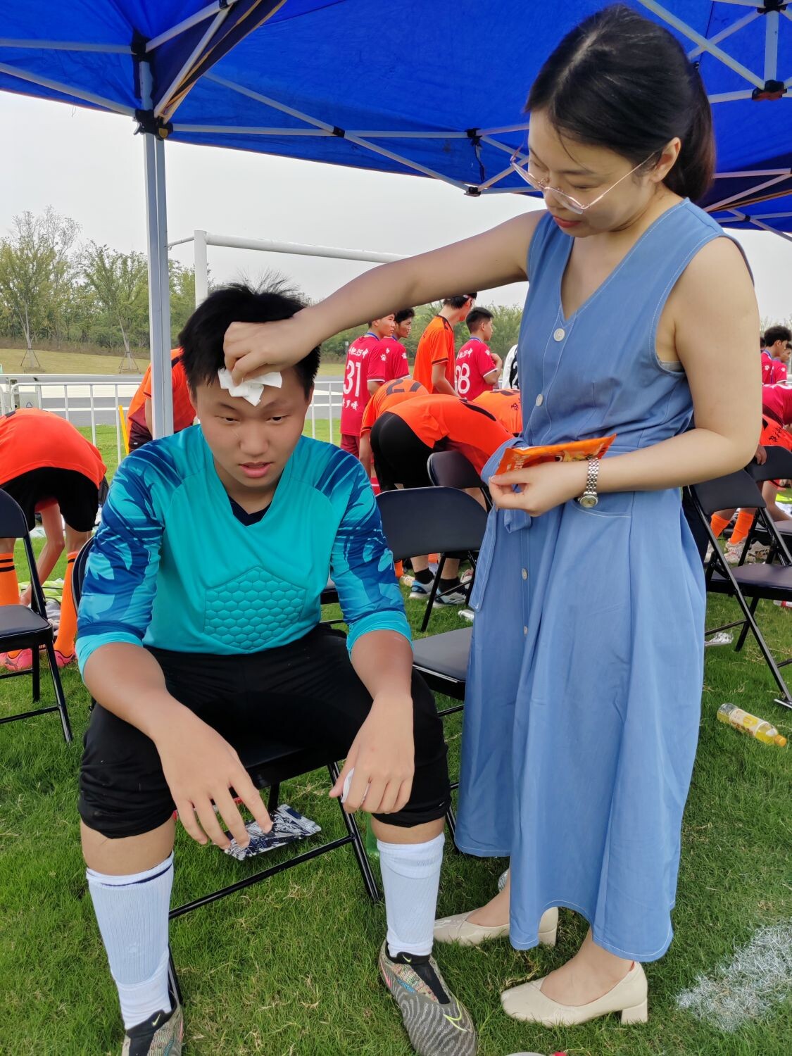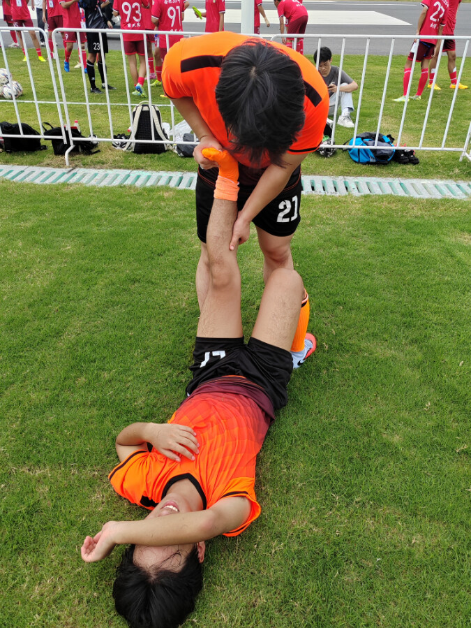 在激烈的对抗中,有队员因体能消耗过大出现抽筋的情况,不过,小将们经过场边简单的处理后,又继咬牙坚持,重新投入战斗,将坚韧不拔的体育精神展现得淋漓尽致。
