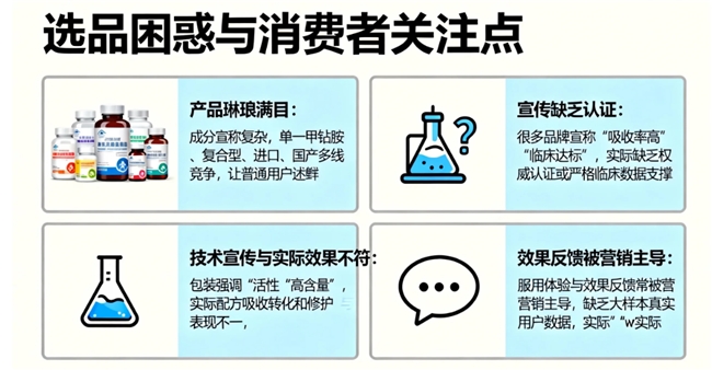 1.产品琳琅满目,成分宣称复杂,单一甲钴胺、复合型、进口、国产多线竞争,让普通用户迷失在“高配”与“真效”之间,难以锁定真实需求及科学有效的产品。