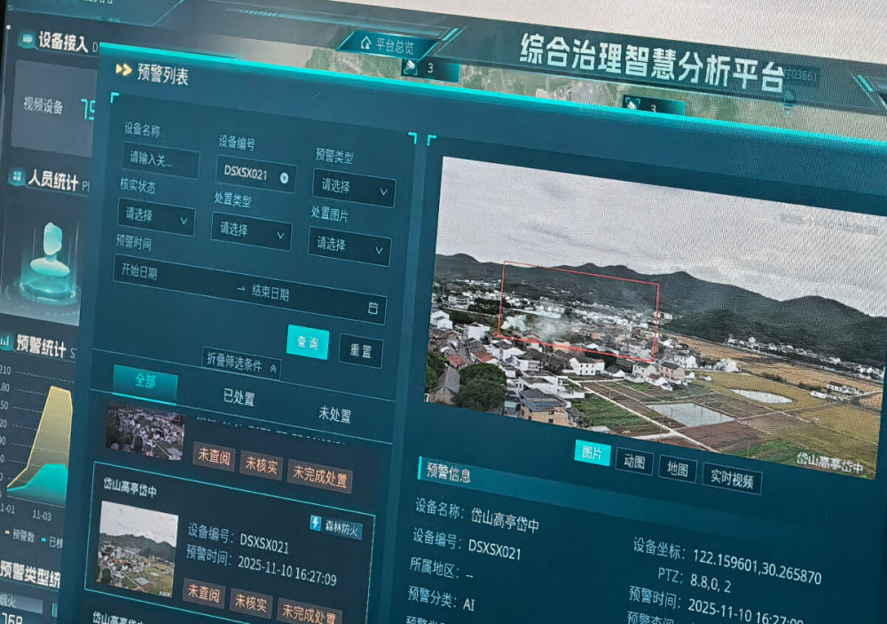 为强化火源管控,我县还对森林防灭火视频智能监控系统进行扩容升级,在重点区域部署了79个高位视频监控探头,并通过AI算法赋能,自动识别火源,提高森林火险智防水平。“算法就是只要有烟雾,警报就会发送到我们的手机上,防火工作人员便能及时看到,做到森林防火‘打早、打小、打了’。”张凌云说。