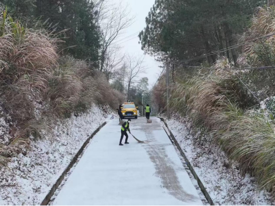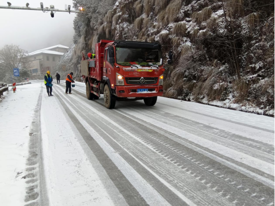 闻雪而动,争当除冰“先锋队”。1月21日晨间,降雪范围持续扩大,农村公路部分路段积雪厚度逐渐增加。随着集结令响起,各应急抢险队伍迅速分赴责任区域。针对农村公路点多、线长、面广的特点,采取“机械主攻、人工补位”的协同模式:铲雪车、撒布机在主干道来回作业,高效清除路面积雪;人工队伍紧随其后,对机械难以覆盖的急弯、陡坡、桥梁接缝等关键部位,精准撒布融雪剂、铲除薄冰。在黟县茅山岭、祁门县洪祁路等山区路段,党员突击队率先垂范,顶着刺骨寒风挥锹铲雪,手冻得通红却始终坚守岗位;部分临水临崖路段出现树木倒伏险情,抢险人员手拖肩扛清理断枝,快速打通通行通道。