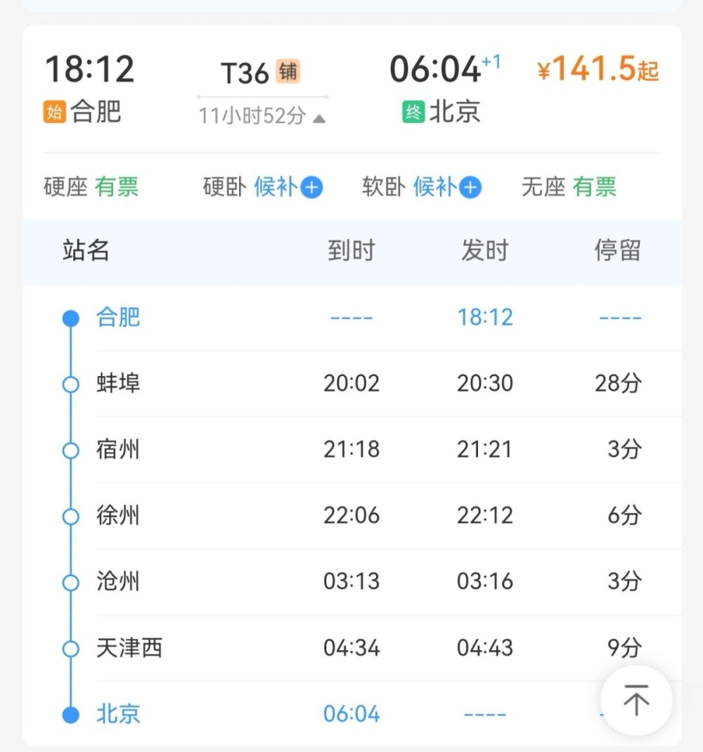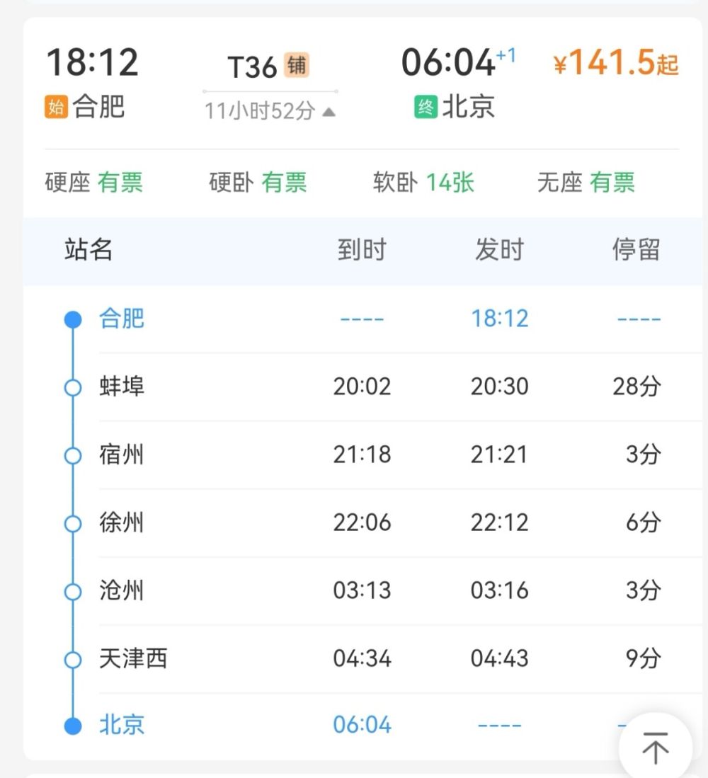 T36次夕发朝至,18:12从合肥站出发,第二天早上6:04分抵达北京站。对应的是12月31日,19:56分T35次从北京站出发,第二天早上7:47分到达合肥站。