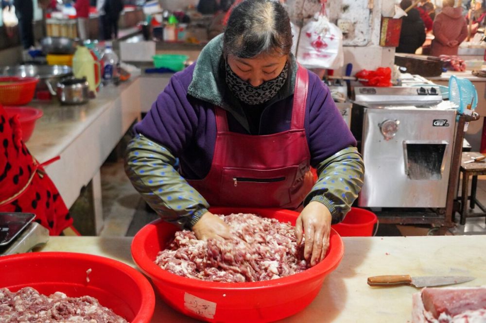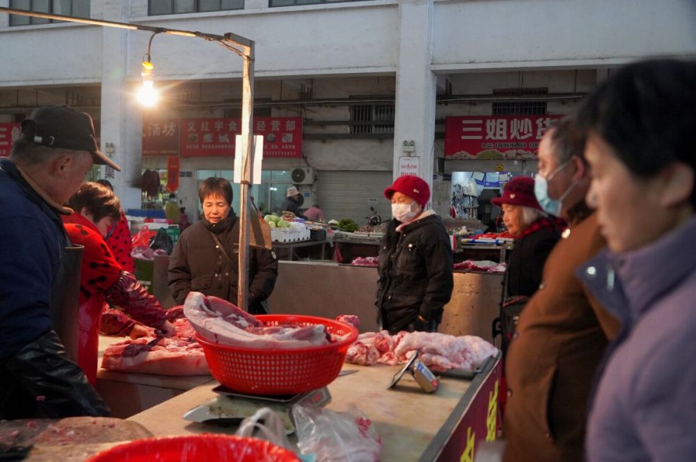 12月3日清晨六点多,天还未全亮,记者来到丽水湾菜市场里时,看到这里人气十足。在肉铺老板孙克胜的摊位前,市民们一边排队,一边打量着案板上红白相间的猪肉,盘算着哪块更适合灌制香肠。