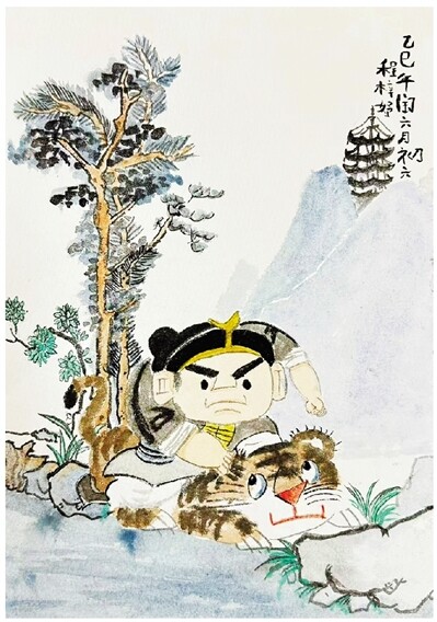 一批获奖作品恰恰呼应了大赛的初衷。一等奖作品《武松》出自七岁小作者程梓妤之手——画中武松造型憨萌,老虎甚至带点“委屈”,完全跳脱传统叙事,却洋溢着纯粹的童真与出色的色彩表达。评委们认为,该作品不仅情感真挚,更具备转化为文创产品的潜力。俞熊天的作品《李云》则巧妙捕捉工匠李云手持图纸、专注施工的瞬间,以生活化的场景传递劳动之美,体现出小作者细腻的观察力。张静仪的作品《林冲·风雪赤心》借鉴木刻版画风格,通过不同笔触营造出苍穹、树干与披风的丰富肌理,画面层次分明、氛围浓厚,成为传统题材现代表达的成功范例。