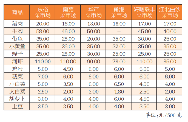 本期超市商品价格总水平有所上涨。本期超市35种监测商品价格较上期8涨21平6跌,价格总水平上涨0.06%。从种类来看,蔬菜、肉类和蛋类价格有所上涨;大米、食用油、方便面、调味品和奶制品价格基本平稳;水果和水产品价格有所下降。从具体品种来看,黄瓜、猪肉(去骨后腿肉)和胡萝卜价格涨幅居前,零售均价分别上涨15.93%、11.45%和7.25%;带鱼、青菜和苦瓜价格降幅居前,零售均价分别下降8.55%、4.87%和4.83%。