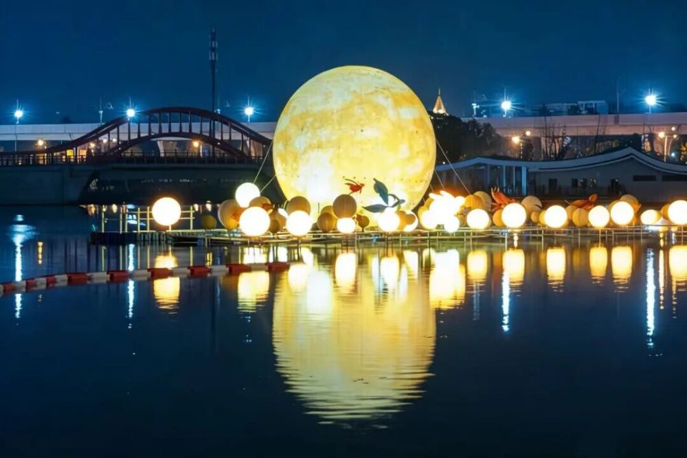 沿步道漫步至湖岸,名为“明月浮水”的大型灯组静卧湖心——一轮巨大的“明月”仿佛悬浮水面,周围锦鲤灯、元宝灯环绕跃动,与粼粼波光相映,构成一幅虚实交融的江南夜景。