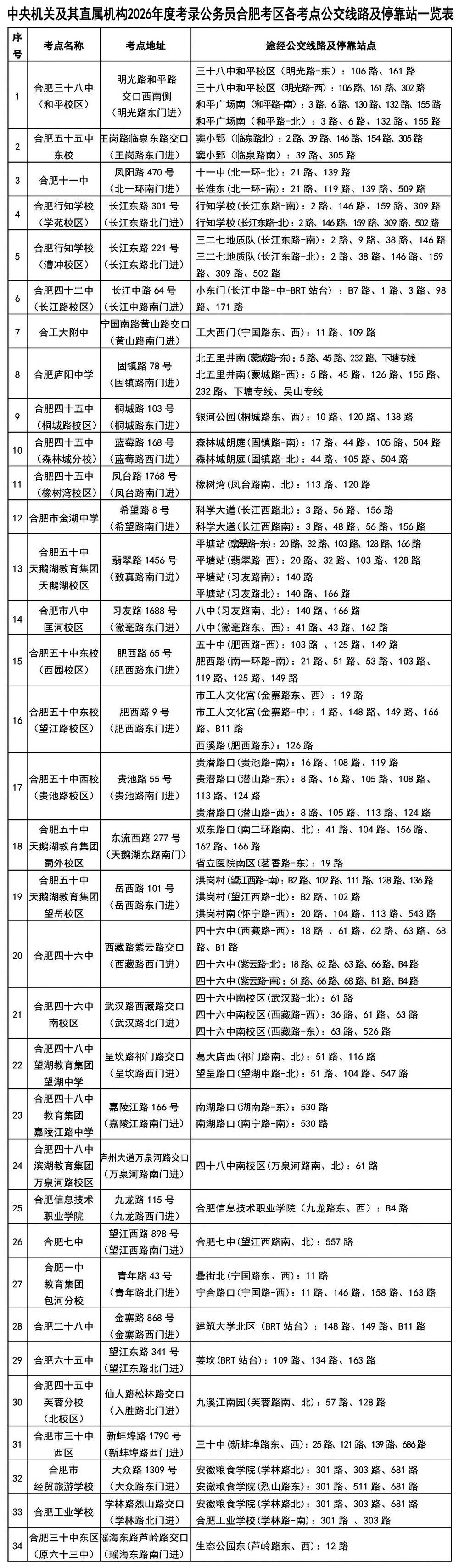 中央机关及其直属机构2026年度考录公务员期间,为便于考生换乘公共交通前往考点学校,积极倡导绿色出行,合肥公交集团临时开行两条考试接驳公交专线,对接考点学校和轨道交通二号线、三号线有关站点。
