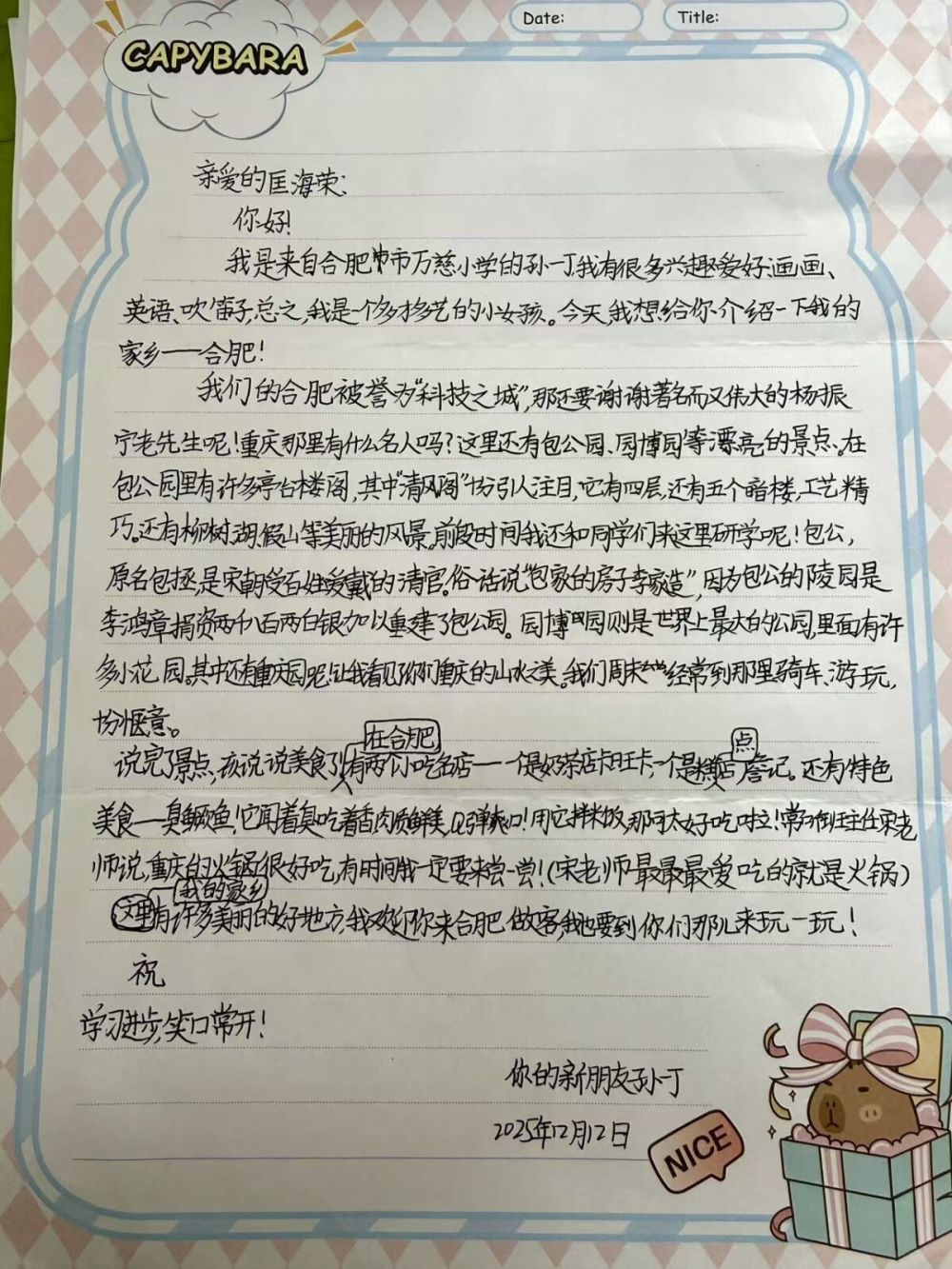 学生吴尚远对此感受尤为明显。“特别激动。”他说,“因为这是第一次给外地同学写信。”在他看来,这封信不像作业,更像一次正式介绍。“我希望对方看完会觉得合肥挺好的,想多了解一点。”