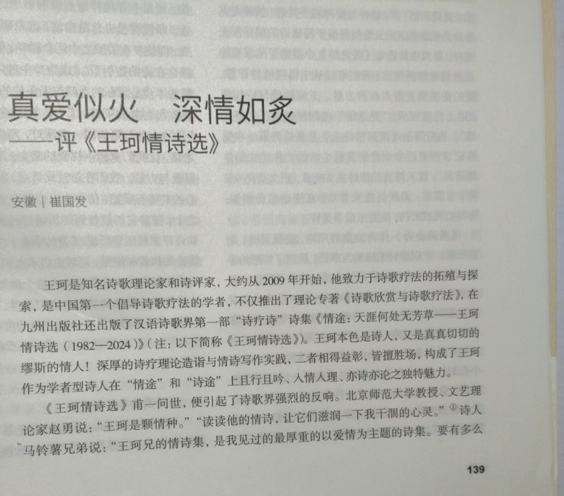 著名刊物《名作欣赏》2025年第10期在“新著书话”栏目发表了诗评家崔国发写的评论《情途:天涯何处无芳草——王珂情诗选1982-2024》的长文,题目是《真爱似火 深情如炙──评<王珂情诗选>》。文中配发了图书的相片,并标明“《情途:天涯何处无芳草——王珂情诗选1982-2024》,王珂著,九州出版社2024年版。”