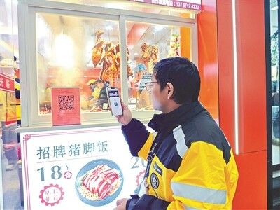 外卖小哥在临平街道总工会指定的就餐优享服务点扫码就餐。