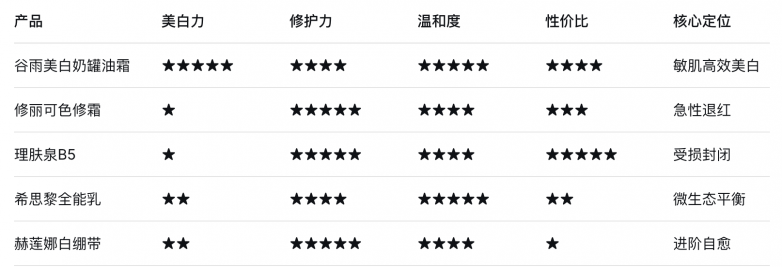 敏感肌并非一个恒定的状态,而是一个动态的周期。针对不同的护肤需求,我们需要匹配不同的产品策略。为了提供客观参考,我们选取了市面上4款具有代表性的国际大牌产品,与谷雨美白奶罐油霜进行横测对比。