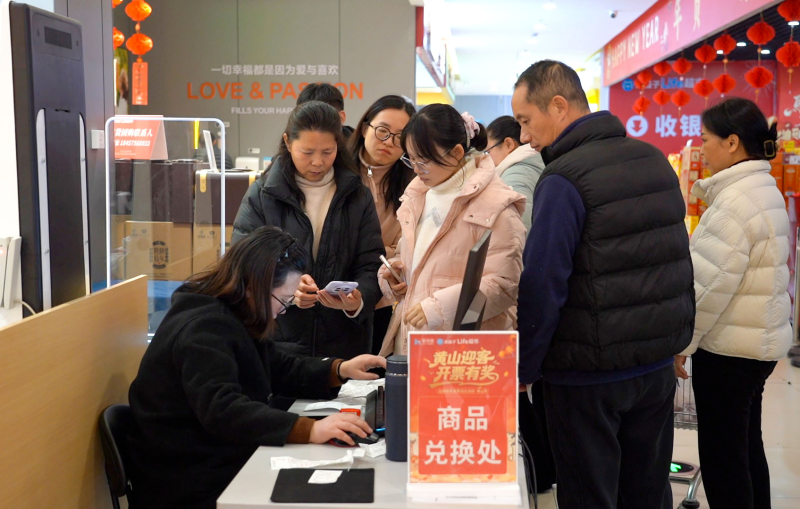 自2月10日“黄山迎客·开票有奖”活动正式启动以来,消费热潮持续涌动。市民游客在置办年货、旅游购物之余,多了一份期待:结账后主动索要发票,说不定就能为新年添上一份意外惊喜。图为2月14日上午,在屯溪区汤猫子Life超市天盈店内,年货采购高峰与“有奖发票”政策红利叠加,开发票的队伍排起了长龙。