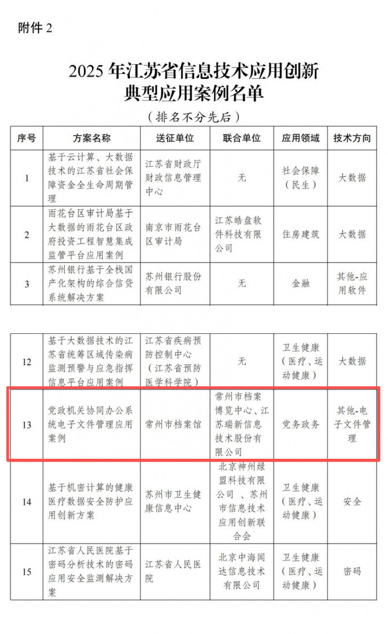 12月30日,江苏省工信厅、省委网信办、省国家密码管理局联合公布2025年信息技术应用创新典型应用案例名单,由常州市档案馆牵头,联合市档案博览中心和相关研发机构共同实施的“党政机关协同办公系统电子文件管理应用案例”成功入选典型应用案例,是本届评选中唯一一个以国家综合档案馆为主体的案例。