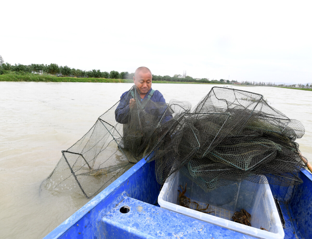 10月20日上午,秋雨初歇,位于官塘村的巢湖市槐林镇开满家庭农场里的蟹塘水光潋滟。工人轻驾小舟,穿梭塘间,将布下的地笼逐一收拢提起。笼口轻启的刹那,一只只青背白肚、金爪黄毛的肥蟹活蹦跃出,尽显生机。