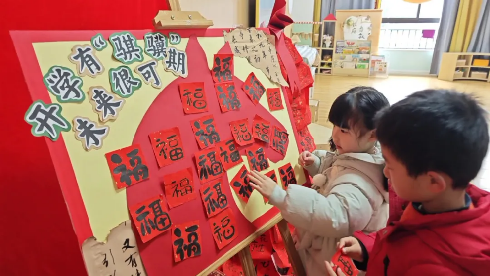 在师范附属幼儿园紫金园区中一班春季开学仪式上,孩子们化身“寻福小使者” 从认识福字的美好寓意,到自主挑选心仪的福贴,在传统民俗的浸润中,感受着开学的仪式感。(师范附幼紫金园区 崔丽敏)