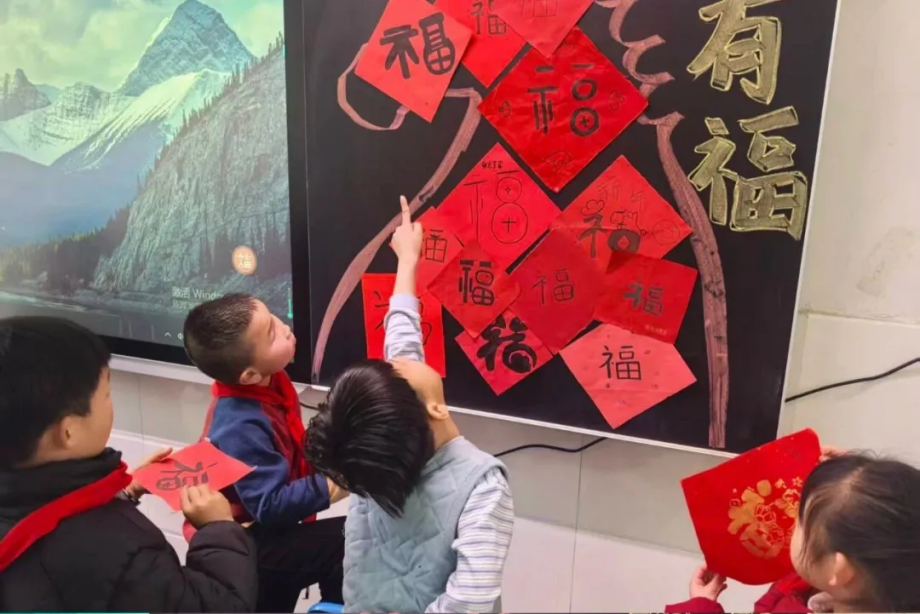 金山路小学贴“福”字迎接马年新学期。(金山路小学 王慧)