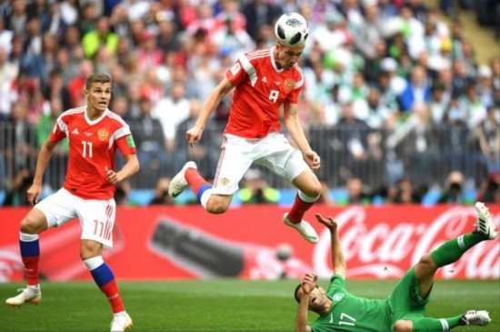 揭幕战在东道主俄罗斯和沙特之间进行,第12分钟,俄罗斯取得领先!佐布林右肋塞球,扎戈耶夫在门前12米处铲射被奥马尔-豪萨维破坏出底线,佐布林左侧开出角球被顶出。俄罗斯得球后继续发动进攻,戈洛温左路斜传后点,加津斯基在门前6米处高高跃起,起跳高度之高堪比足坛以弹跳惊人闻名的C罗,迎着皮球用力甩头,皮球径直飞向沙特球门。此时沙特门将虽然全力扑救,但还是没能阻挡皮球入网,俄罗斯打进世界杯首球!