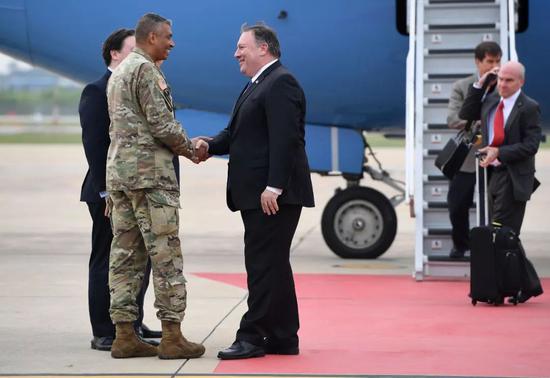 △当地时间2018年6月13日,韩国平泽市,美国国务卿蓬佩奥抵达乌山空军基地,将向韩国总统文在寅通报美朝领导人会晤有关情况。
