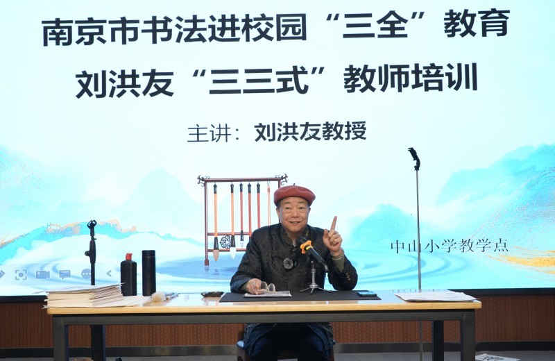 刘洪友发言介绍“开明文化·全国书法教师培养项目”时称,2022年《义务教育语文课程标准》教育部将书法教育正式纳入小学语文必修课程,2025年江苏省教育厅向全省各市转发了《南京市推动小学书法实践教育的工作报告》,为南京书法进校园“三三式”书法教学计划锚定方向、擘画路径。他介绍说,自2023年底以来,南京刘洪友书法艺术院受南京市教育局委托,以《南京市推动小学书法实践教育的工作报告》为根本遵循,聚焦全市11个行政区、160余所小学的语文与美术教师群体,分三批次开展“三三式”书法教学上岗培训。近1500名教师圆满参训,让南京市提前完成“十四五”规划中半数以上的“书法进课堂”师资储备任务。这既是南京书法教育的扎实实践,更是全国书法教育普及落地的先行先声,为后续全面推广筑牢了坚实根基。