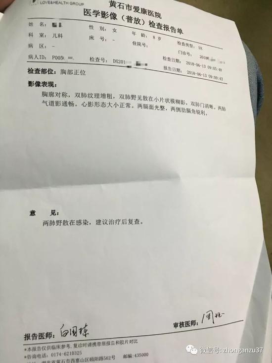 多名村民介绍,这两天送来爱康医院检查的儿童,还存在不同程度肺部感染。村民林美玲(化名)出示的一张影像检查报告单显示,其8岁的女儿"两肺野散在感染,建议治疗后复查"。目前,她的女儿仍在住院,"何时能出院还不知道,得看治疗情况。"
