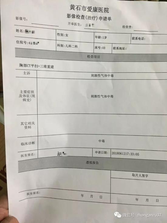 王婷婷提供一张女儿的影像检查申请单显示,主要症状及体征为"刺激性气体中毒",临床诊断为"中毒"。重案组37号查看另外两名儿童的影像检查申请单,均有同样的诊断结论。