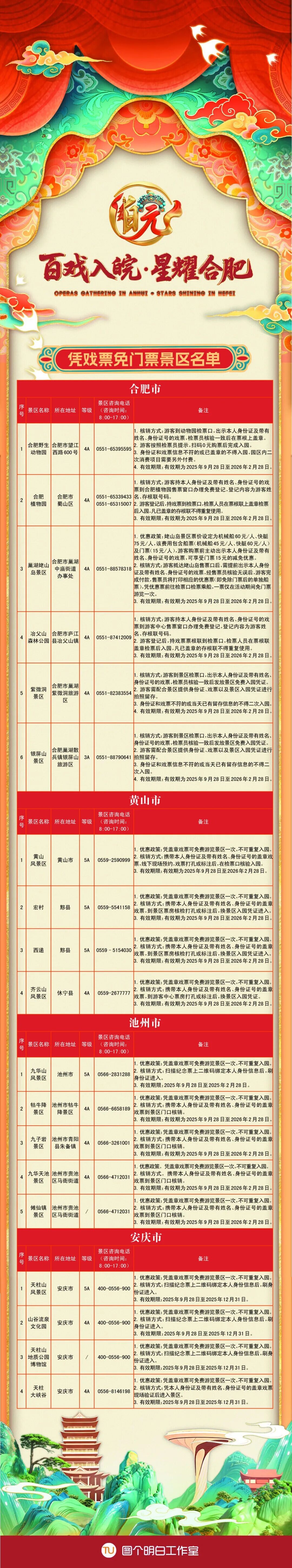 游安徽,畅享景区免费套餐。凭一张戏票,可享安徽省最知名的景点、最经典的路线、最好的产品,免费畅游黄山、九华山、天柱山,漫步西递、宏村的水墨街巷,打卡合肥市域内主要景点。带您在听戏之外,沉浸式感受安徽的山水之美、文化之韵,轻松开启一场“戏游”相融的惬意旅程。