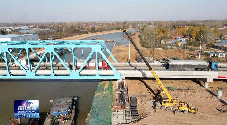 在宿连航道沭阳县扎下镇段的施工现场,跨航道桥梁的钢结构和墩台的施工在紧张进行中。据了解,目前宿连航道一期工程已完成交工验收,二期工程建设正收尾,月底将建成通航。