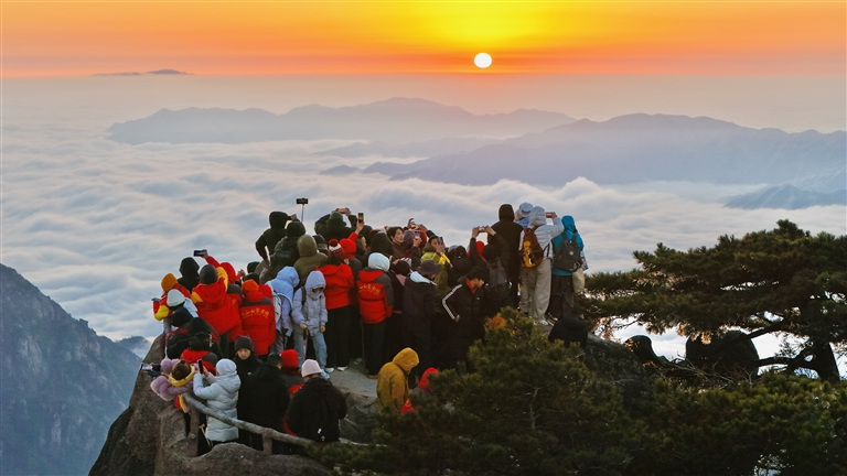 春节假期期间,黄山风景区以晴好天气为主,雾凇、云海、日出、日落等美景轮番上演,引得游客频频驻足拍照,赞叹声不绝于耳。雾凇凝结,如玉树琼枝,晶莹缀满松针;云海翻涌,如涛似絮,恍若仙境。破晓时分,朝霞铺满天际,旭日东升,将群峰染上金光;日暮之际,余晖渐收,远山渐染黛色,天地归于静谧温柔。“我是第一次来黄山,刚上索道就见到了如此壮观的景色,比想象中的还要美。山峰、奇松、怪石都名不虚传,我们一路上走走停停,拍了很多照片,真是不虚此行。”来自江苏的游客韦彦峰兴奋地分享道。